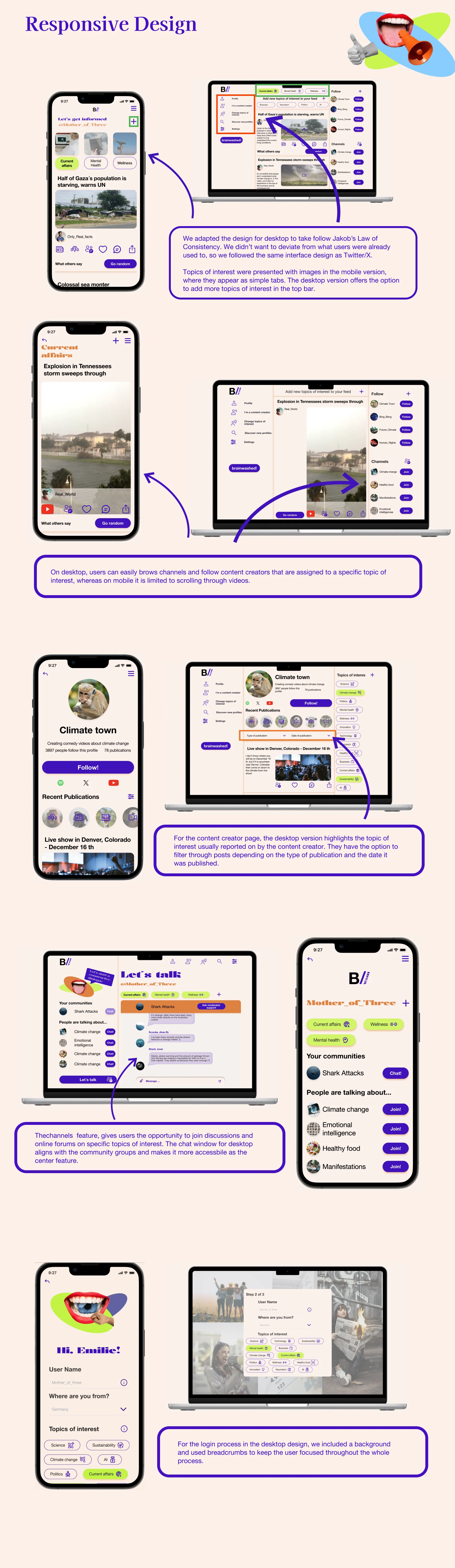 We did responsive designs for mobile and desktop to facilitate the usability and accessibility of the Brainwash app to obtain a higher user volume. According to the Interaction Design Foundation, responsiveness is “possible thanks to media queries, allowing the design to adjust automatically to the browser space to ensure content consistency across devices, and design elements being sized in relative units (%)”