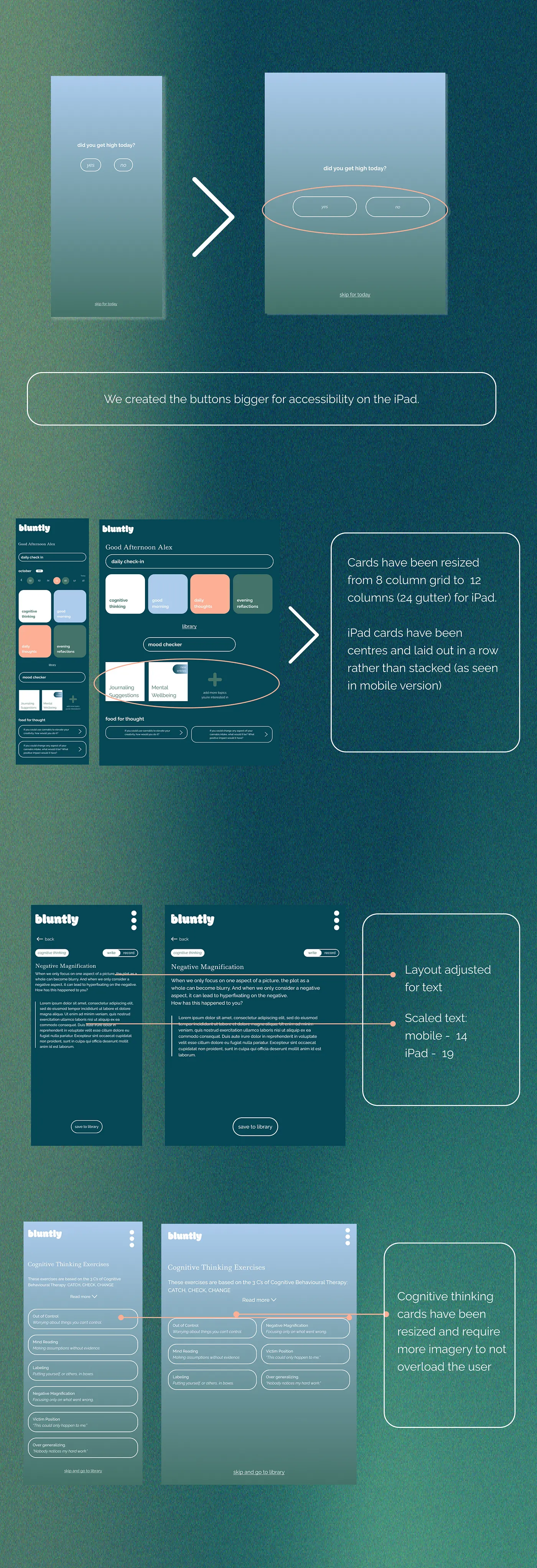 This was a challenging but fun project to work on. Due to the sensitivity of mental health, we had to take proper care to ensure that our information was scientifically factual. We had some trouble reaching the 100-respondent benchmark for the survey during our research phase, but we managed to get above 50. Also, I encountered a learning curve on Figma with auto layout, components and variant designs. After some guidance from Laura, the designer, on the team, I applied the feedback in our responsive designs for iPad, I understood the importance of layout on different screens.